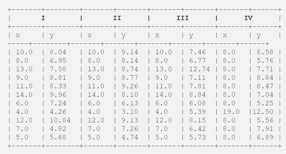 This is Anscombe's quartet, which will help explain my love of data. These four datasets contain different numbers but are statistically identical. They have the same mean, standard deviation, correlation, and linear regression equation. If you stop here, you may think these datasets are all the same.